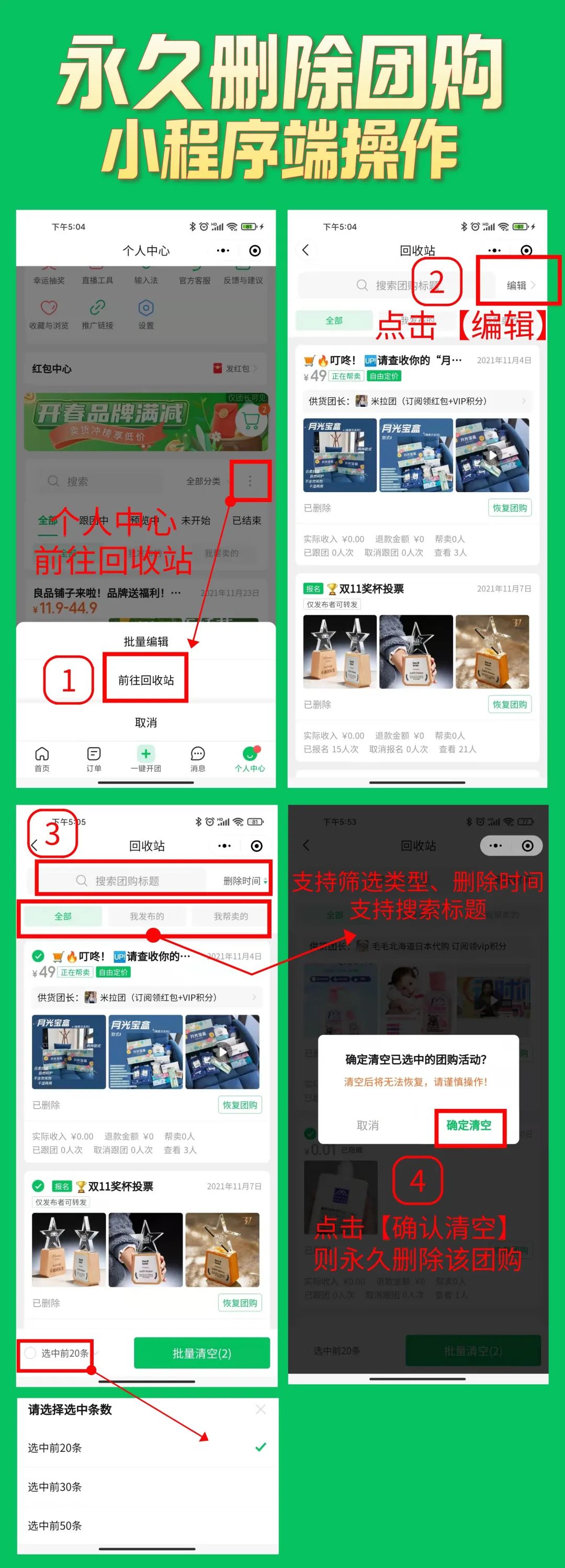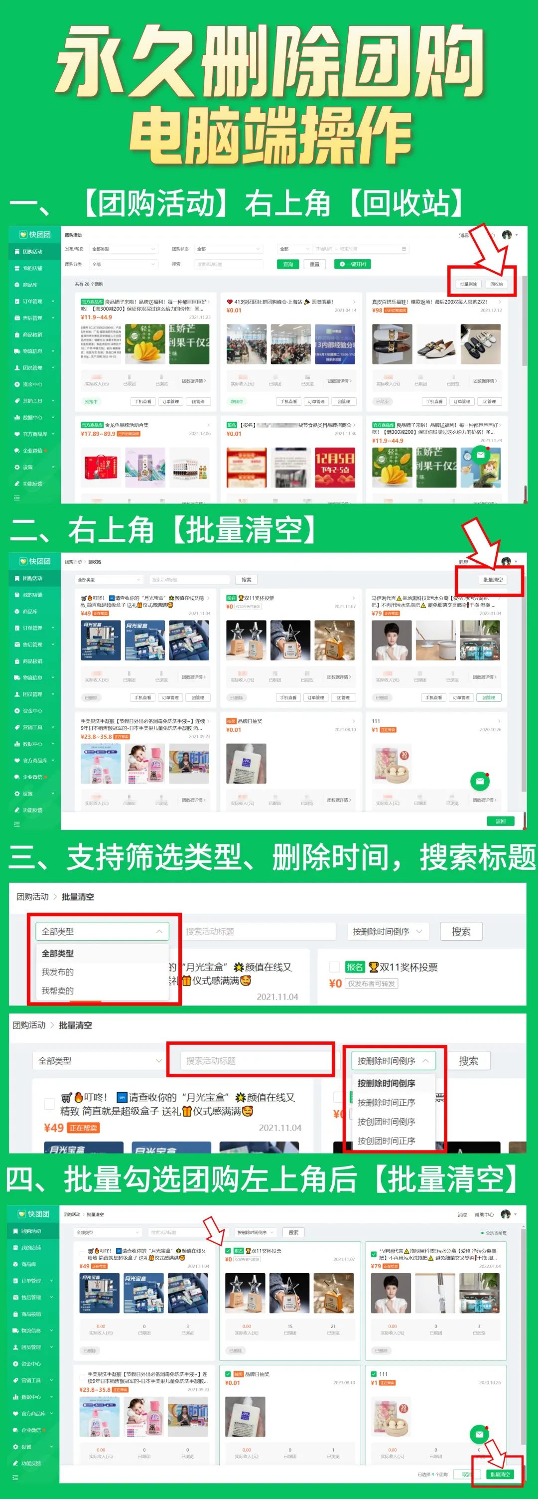团长需要定期删除过期团购,久而久之【回收站】堆积成灾。