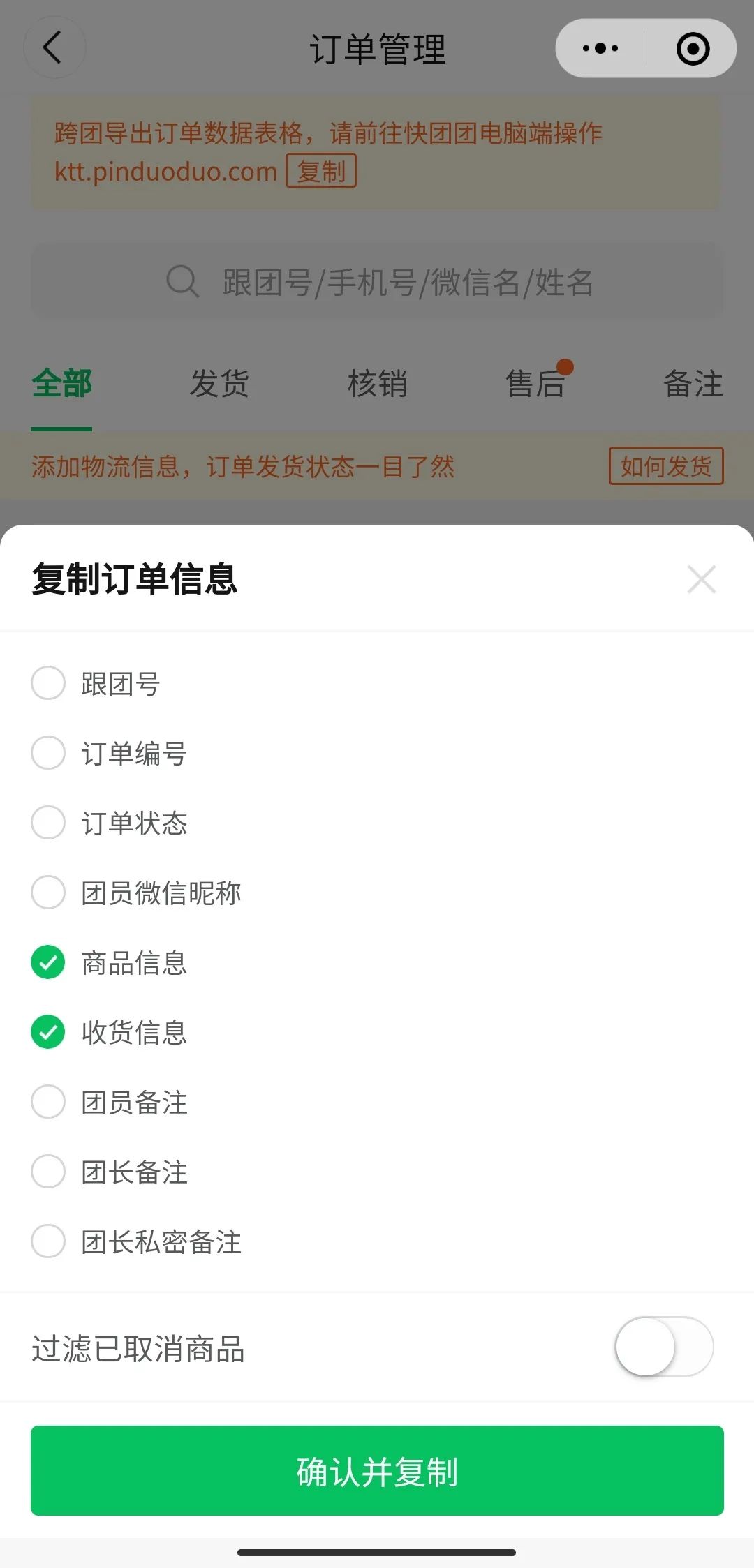 为了适应所有沟通场景,团长可以 自主选择要复制的订单信息,大大节省操作沟通时间。