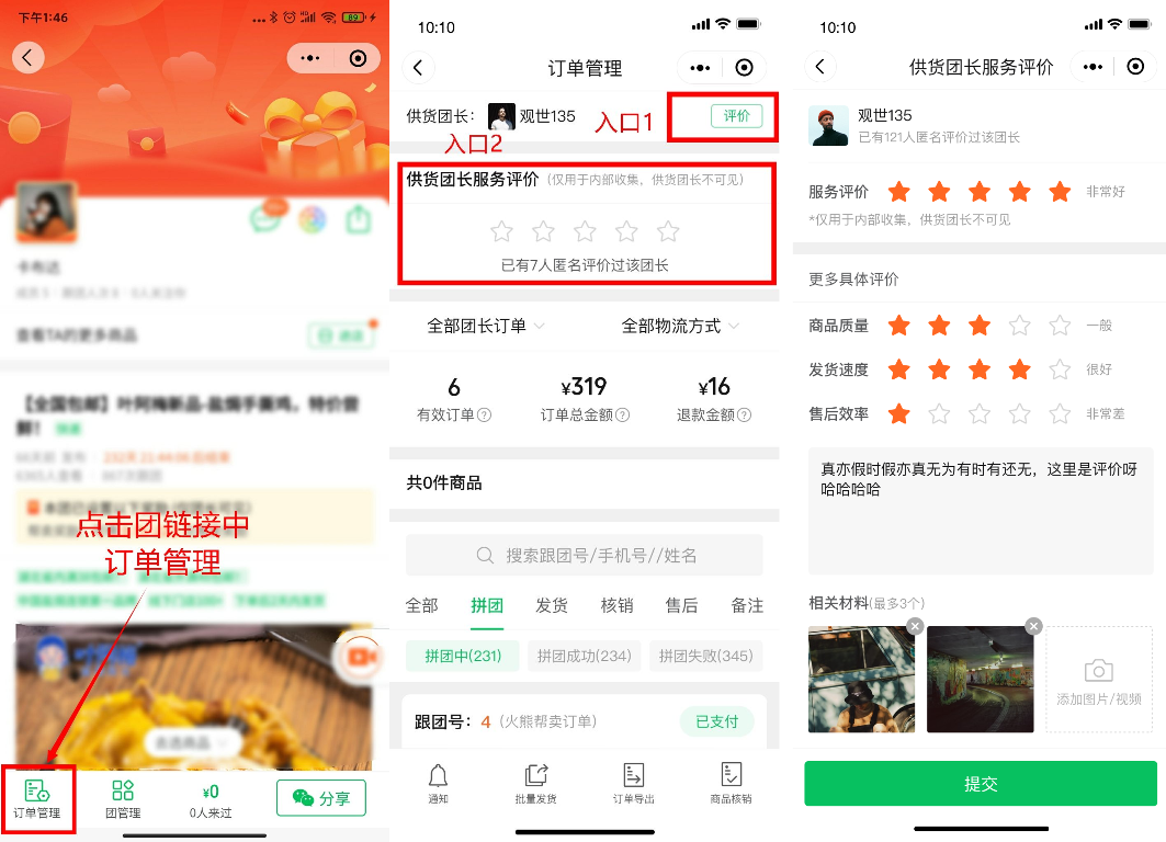 点击 团详页 左下角的订单管理,可以看到评价入口,点击进入即可对该团的供货团长,从多个维度进行评分。