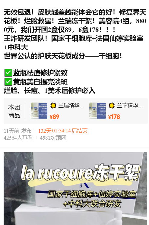 蓝可瑞冻干絮快团首发,极致性价比! 院线功效+日化价格+超级福利放送!美容院指导价2200元1组,快团团89元2组还额外有赠品!