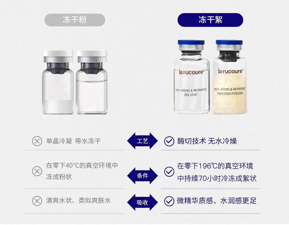 冻干絮的修护功效更强 , 全新的冻干技术+糖化技术+包裹技术+酶切技术,保证多重活性成分纯净度更高,将大分子结构成小分子后更针对性到达肌底起效,大大提升肌肤吸收力。