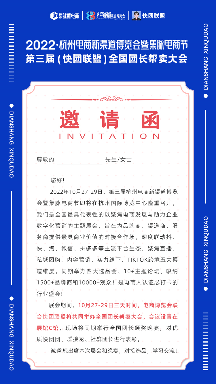 2022/09/02 2022杭州电商新渠道博览会暨集脉电商节,第三届(快团联盟)全国团长帮卖大会,开始邀请和报名!