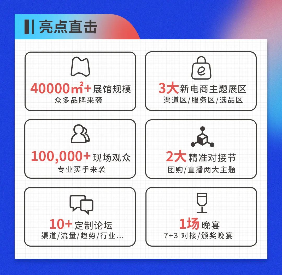 去年,我们联合杭州电商新渠道博览会,主办的"全国团长带货节",组织了团长对接会,取得了非常好的反馈,今年我们继续组织团长大会,在去年的基础上优化内容,提升活动水平,力求给到参展商、供应商、团长渠道嘉宾更多的收获。\