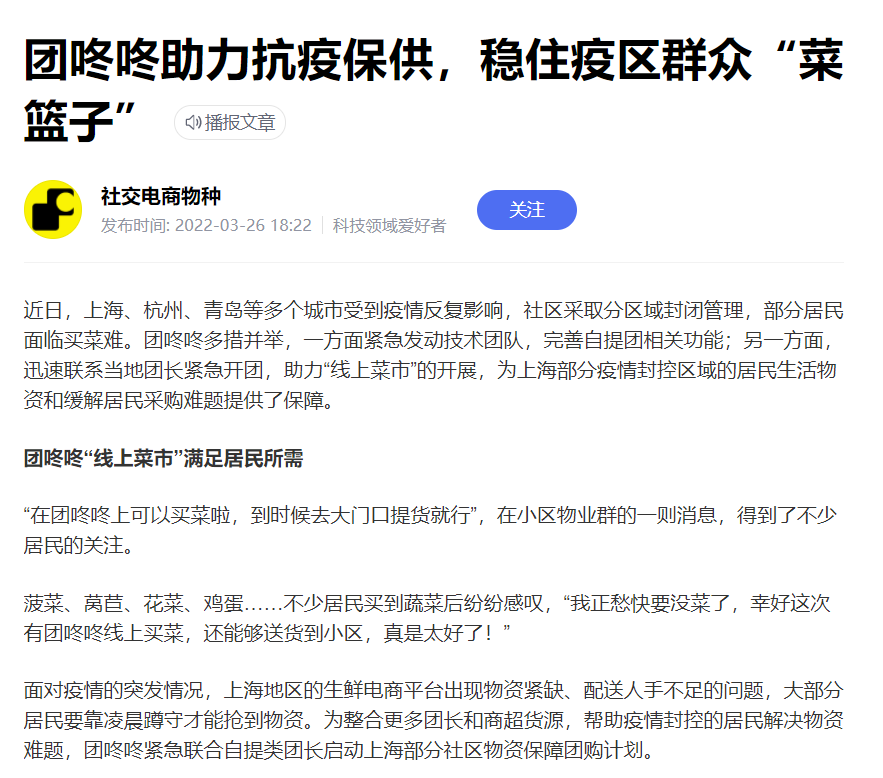 同时,我也注意到,团购小程序在疫情中发挥了不小的作用,团长可以通过快团团、团咚咚等工具,把蔬菜食品快速开团,给到社区居民跟团下单。