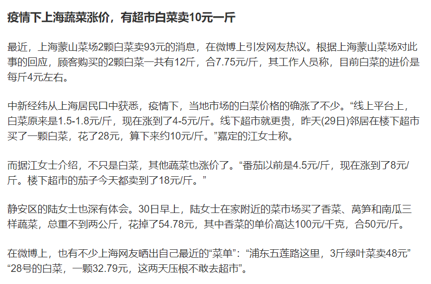 最近看新闻,也多次刷到上海的食品蔬菜价格飞涨,并且还不一定买得到。\