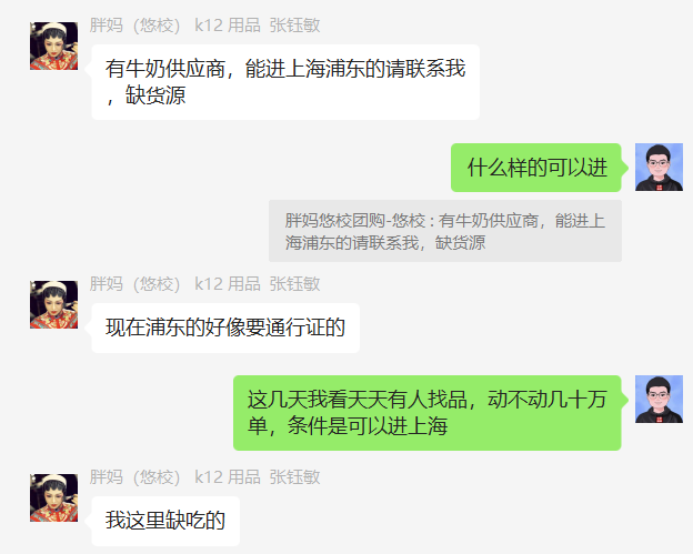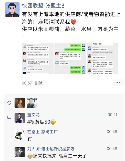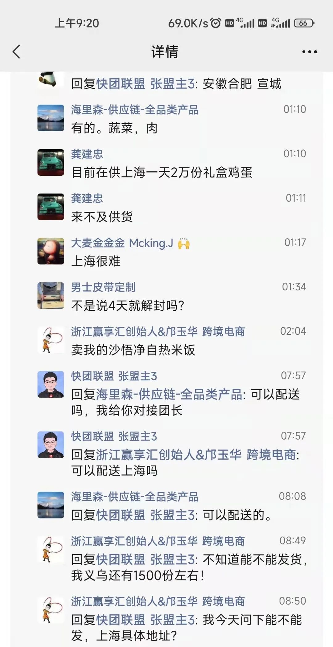 基于上海的团长,还有很多缺少足够的食品供应, 我昨天晚上就在朋友圈发了一个朋友圈,找一下有没有可以提供食品的供应商!收到的反馈还是很多的。