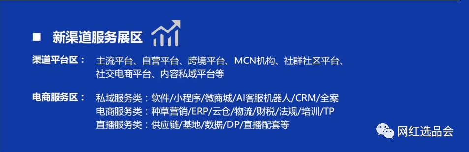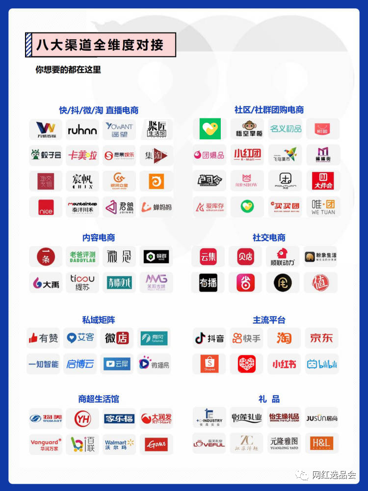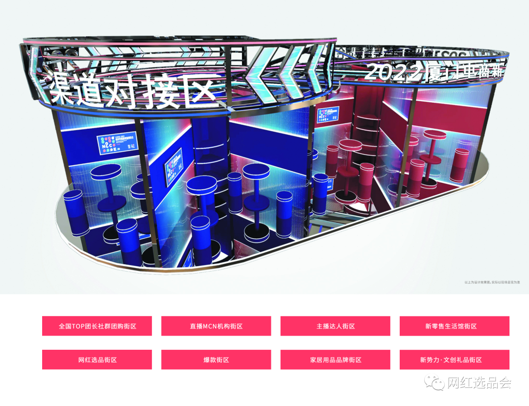 围绕网红选品/直播带货/打造爆品等主题。展内场联动引爆, 300+大咖 / 800+社群团购创业者/100+出货平台 ;同时创新设立八大新渠道服务街区: 全国TOP团长社群团购街区/直播MCN机构街区/主播达人街区/新零售生活馆街区/网红选品街区/爆款街区/家居用品品牌街区/新势力·文创礼品街区/全球跨境好物街区 等,带上你的好货在这里找到对的渠道吧!