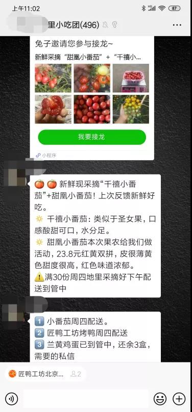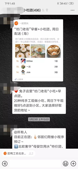 一开始,团购群的群主是我们小区的业主,自己有一家家乡特色的小吃店,每周隔三差五会帮业主团购店里的早餐,后来,慢慢的,这个群就从早餐群,变成了囊获了水果、大米、鸡蛋、甚至西点、烤鸭,所有跟吃有关的一切,都可以在群里定期团购。