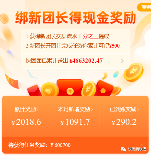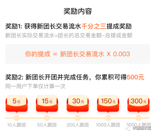 比如,我推荐一个新人成为团长,最高我有计划拿到500元奖励(如果他完成认为,开团出单3000单),并且我还可以拿到他半年内销售额的一个比例的奖励,补贴很猛,拼多多的风格!比如,每个团长设置有分享帮卖的佣金奖励,这个已经吸引一大批人专门去分享团长帮卖二维码,来赚佣金的人。有些人仅仅只是分享传播二维码,倒卖这方面的资源,每天就可以被动收入几百元。