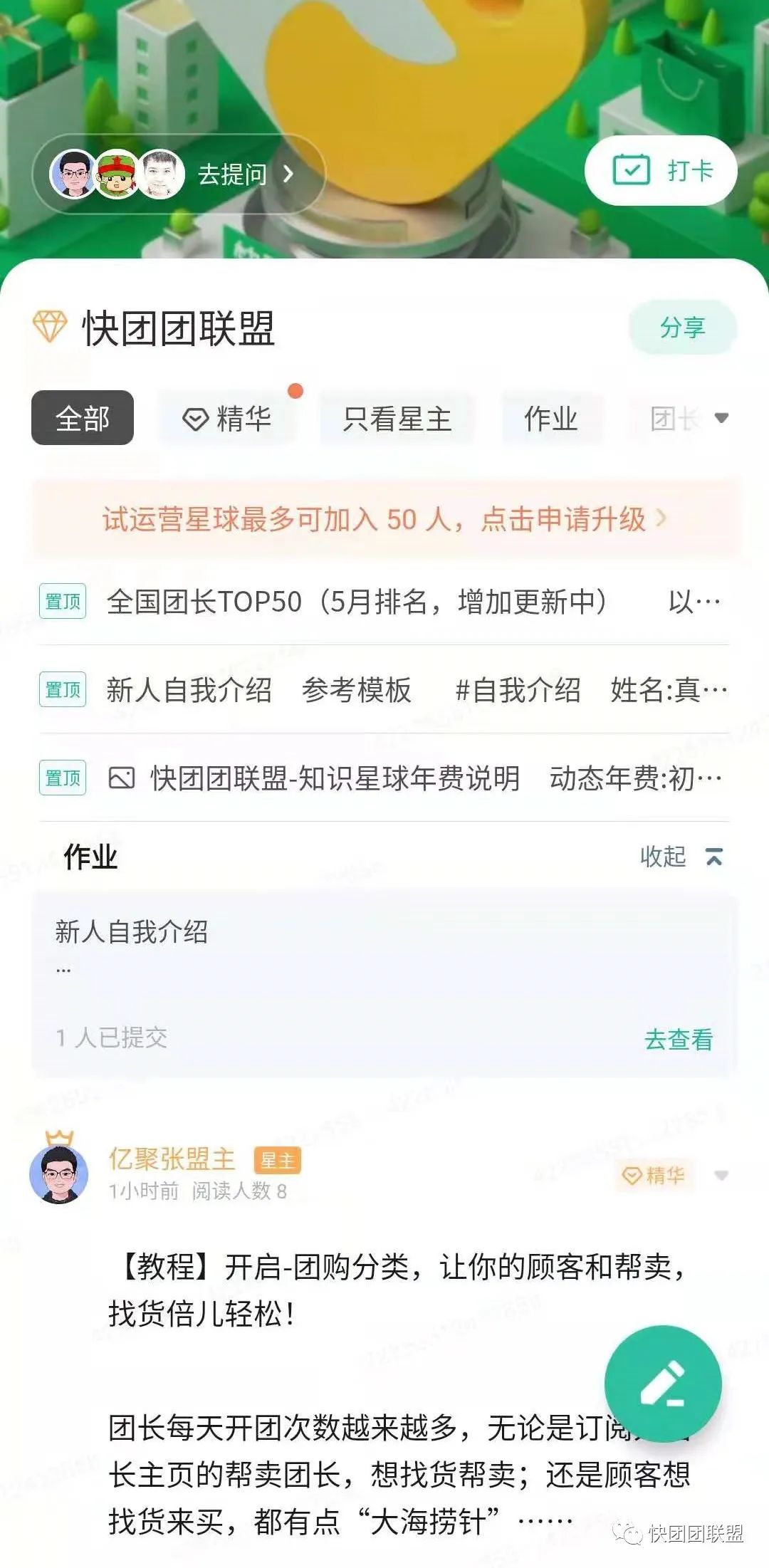 星球是什么: 快团团联盟的知识星球是快团团领域的交流社区。加入星球后,可以看到星球内所有资料和文章,可自己发布内容。建议加入之后,下载知识星球APP,方便登陆查看。