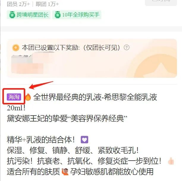 群团团的某些产品,会有一个紫色的标签"海淘",非常醒目。\