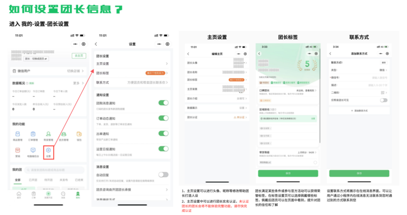 在小程序 "我的-设置-团长设置"中可以进行编辑团长头像、团长昵称、设置团长主页背景、团长介绍、团长标签、团长联系方式、完成团长认证等操作