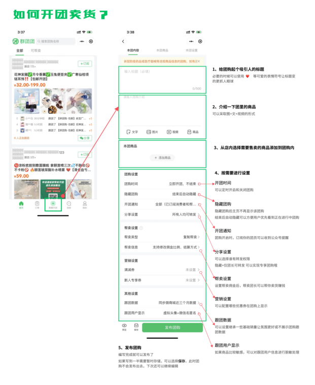 点击底部栏中【我要开团】,编写团购信息,完成相关设置即可发布团购