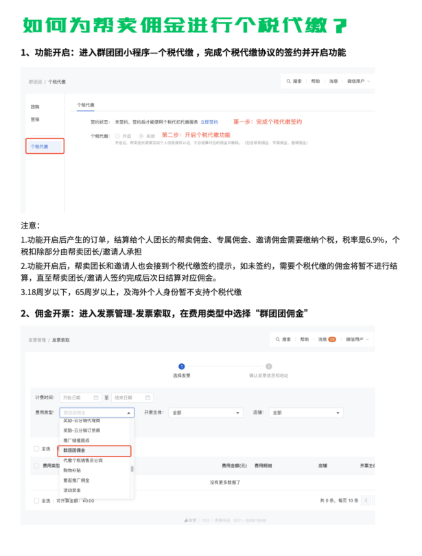 a.功能开启后产生的订单,结算给个人团长的帮卖佣金、专属佣金、邀请佣金都需要缴纳个税,税率是6.9%,个税扣除部分由帮卖团长/邀请人承担