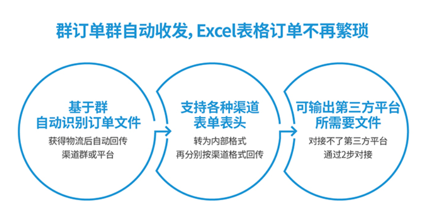 供应商和团长,大部分的对接场景,就是在微信群。在群里,团长发出订单表格,供应商下载表格,安排打单发货,然后又回传表格到群里,团长在后台上传单号。八爪云就做了一个智能的订单机器人,不需要团长下载表格,也不需要手动上传单号,直接对接匹配号微信群,就可以搞定了。