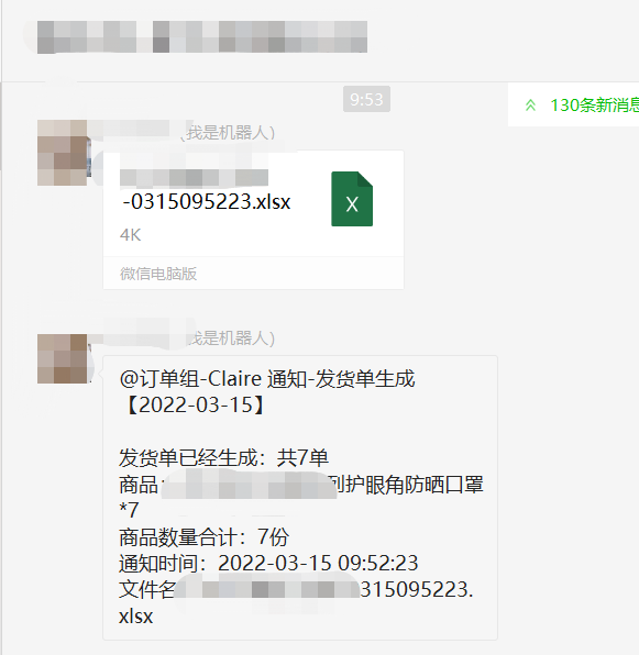 某团长对接群的机器人发送订单截图\