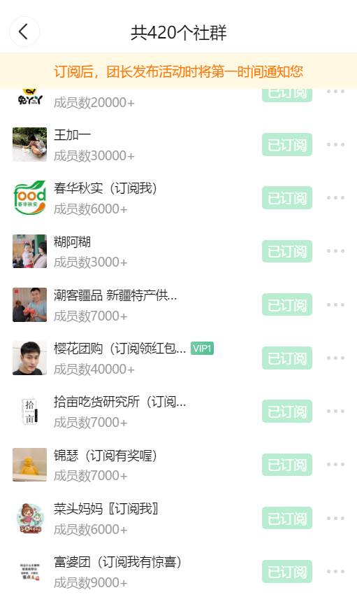 这个是我的快团团账号目前订阅的团长,有400多个!如果你们也订阅了这样数量的团长,你就会每天看到大量的团品,并且会发现很多优质团长。这样的信息哪里来?需要已经订阅的人分享给你才能订阅,你可以去找有这样资源的人。\