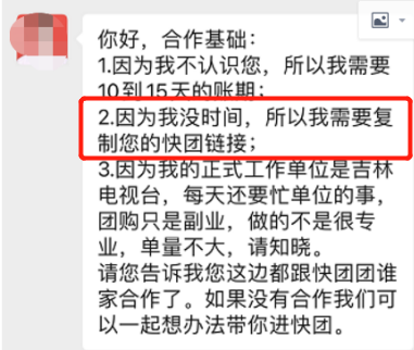 玩法2:自己一个个去对接快团团的团长, 联系上后,提交产品,选品,谈价,确定账期(自己谈),发货,售后,结款;这个我称之为毛遂自荐的模式;