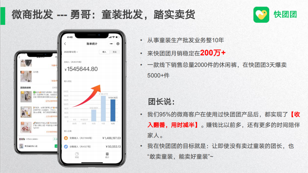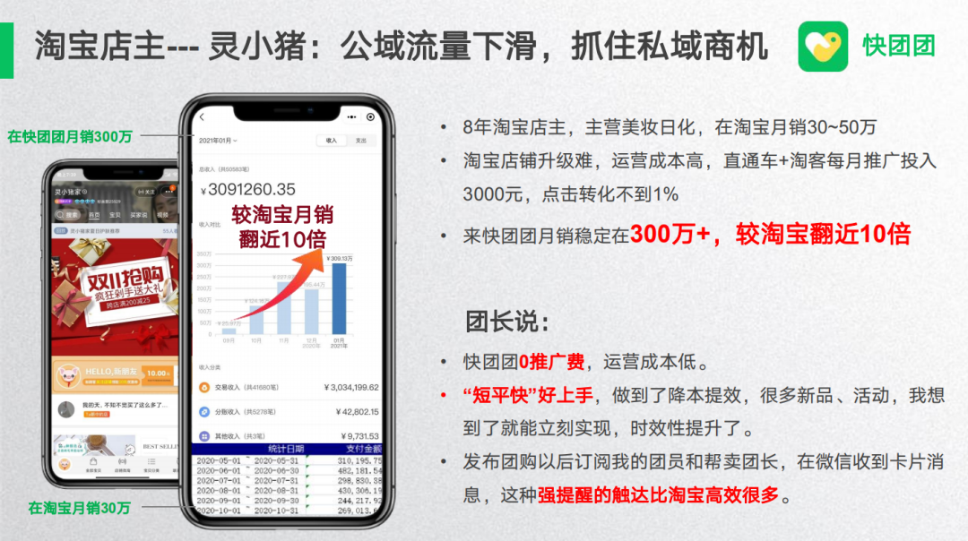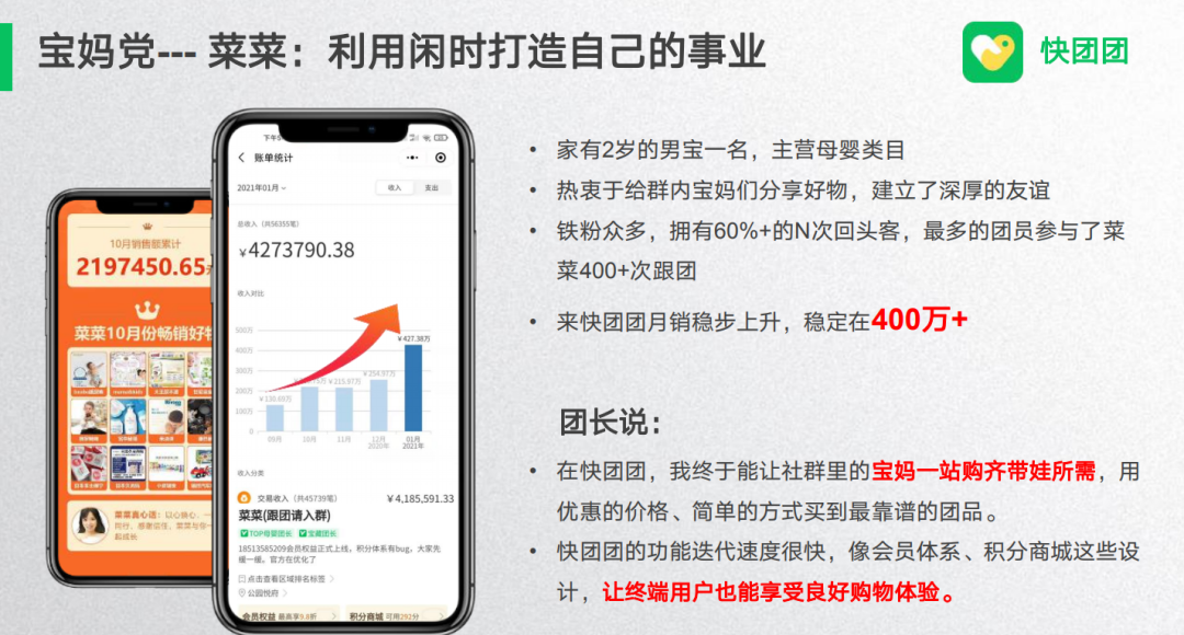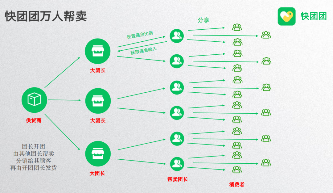 对于团长来说,极大降低门槛和成本,天然的对于大量想赚钱的人有吸引力,特别是对于微商团队、社群团购的团长、淘客、宝妈、有私域流量的人、线下老板等,都是一个非常好的转化工具。目前已经有很多团长和淘客开始迁移到快团团。到目前为止的官方数据是100万团长,我觉得按照这个发展速度,很快可以到200万团长,甚至可以到1000万团长。