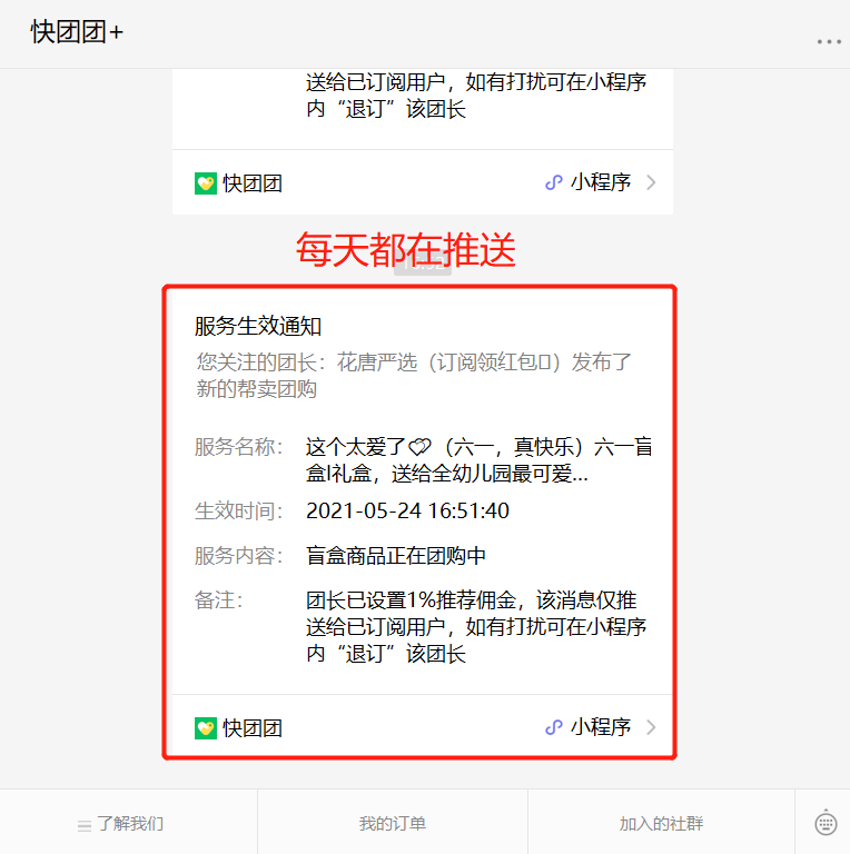 这样的通知是非常高效的,也是一种非常好的触达用户的方法。如果你的团有10万人订阅,也就意味着,你每次发布新产品,理论上有10万用户看到,并且直接进入购买,这是不是非常恐怖?