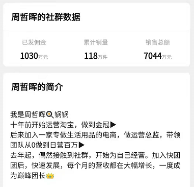 全国排名第七的周哲晖,一年时间,团成员5万+累计销售118万件,发放佣金1030万,销售总额7044万,吓死人的数据!\